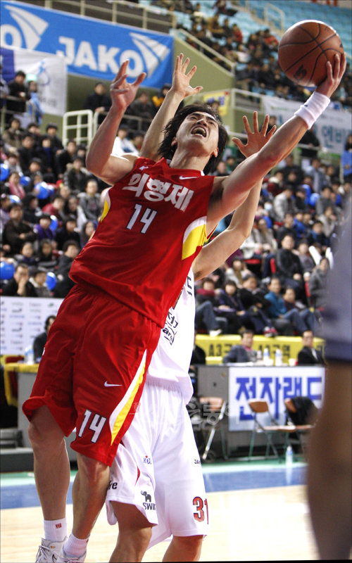 26일 오후 인천삼산월드체육관에서 열린 2009∼2010 KCC 프로농구 인천 전자랜드 엘리펀츠 대 대구 오리온스의 경기에서 오리온스 오용준이 골밑슛을 시도하고 있다.