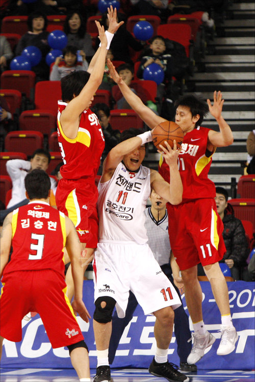 26일 오후 인천삼산월드체육관에서 열린 2009∼2010 KCC 프로농구 인천 전자랜드 엘리펀츠 대 대구 오리온스의 경기에서 전자랜드 서장훈이 상대의 더블팀에 막혀 고전하고 있다.