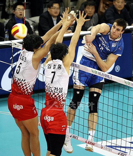 09-10 남자프로배구 LIG 대 삼성화재 경기가 26일 구미 박정희체육관에서 열렸다. 삼성화재 가빈이 LIG 김요한과 김철홍의 블로킹 사이로 스파이크를 날리고 있다. 구미 | 김종원기자 won@donga.com