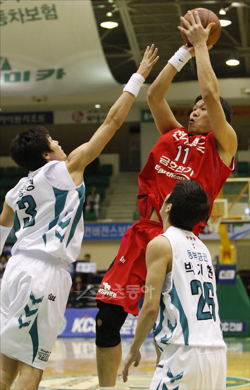 28일 오후 원주 치악체육관에서 열린 2009∼2010 KCC 프로농구 원주 동부 프로미 대 인천 전자랜드 엘리펀츠의 경기에서 전자랜드 서장훈이 페이드어웨이 슛을 시도하고 있다.