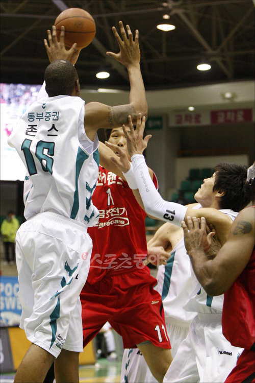 28일 오후 원주 치악체육관에서 열린 2009∼2010 KCC 프로농구 원주 동부 프로미 대 인천 전자랜드 엘리펀츠의 경기에서 전자랜드 서장훈이 동부 존스의 수비벽에 가로막혀 고전하고 있다.