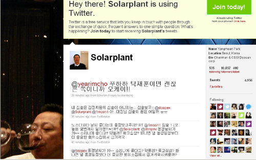“소녀시대와 원더걸스 중 회장님의 선택은 어느 쪽인가요? @Solarplant ‘노바디’가 누구 거지요?”“회장님은 회장실에서 밖을 바라볼 때 무슨 생각을 하시나요? @Solarplant 글쎄요 ‘내가 어제 뭐 먹었지?’ @Solarplant 헉! 난 화장실로 봤슴다. 미안합니다.”