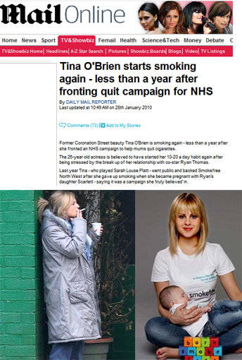 영국 일간지 데일리메일 인터넷판은 28일(현지시간) 배우 티나 오브리엔(Tina O'Brien, 26)이 영국 국민건강보험(NHS)의 금연 캠페인에 나선지 1년도 채 안된 상황에서 다시 담배를 피우는 장면이 사진에 찍혀 대중의 비난을 사고 있다고 보도했다.