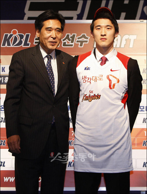 3일 오후 서울 양재동 교육문화회관에서 열린 ‘2010 KBL 국내신인 드래프트’에서 1라운드 4순위로 서울 SK에 지명 된 변기훈(건국대)이 신선우 감독의 축하를 받고 있다.