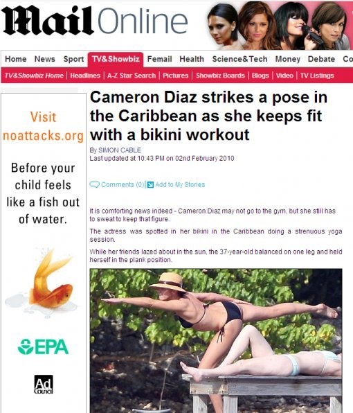 디아즈는 이 매체와의 인터뷰에서 30대 후반의 나이에도 아름다운 몸매를 유지할 수 있는 비법을 밝혔다. "헬스를 싫어해 등산을 비롯해 스노보드, 서핑 등 활동적인 아웃도어 스포츠를 즐겼다"는 것이 그녀의 설명.