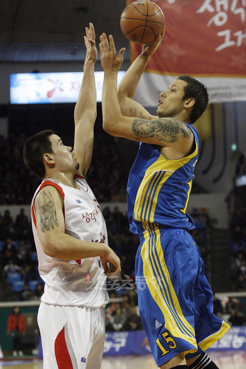 7일 오후 잠실학생체육관에서 열린 2009 남자프로농구 SK 나이츠 대 삼성 썬더스의 경기. 삼성 이승준이 SK 김민수의 수비를 피해 슛을 시도하고 있다.