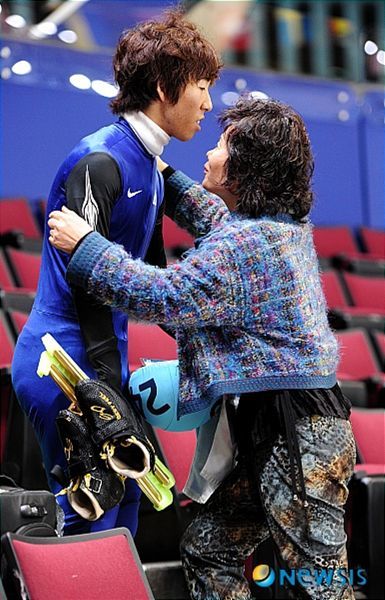 15일 오전(한국시간) 캐나다 밴쿠버 퍼시픽 콜리시움에서 한국 쇼트트랙 선수단의 공식훈련이 있었다. 훈련을 지켜보기 위해 경기장을 찾은 성시백의 어머니 홍경희씨가 이호석에게 격려의 말을 전하고 있다. [뉴시스]