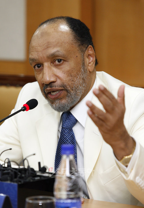 모하메드 빈 함맘 아시아축구연맹(AFC) 회장이 16일 축구협회를 방문해 기자회견을 갖고 있다.