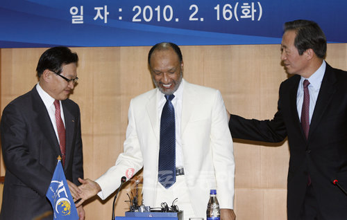 조중연 축구협회장이 16일 축구협회를 방문한 모하메드 빈 함맘 아시아축구연맹(AFC) 회장과 기자회견이 끝난 후 악수하고 있다.