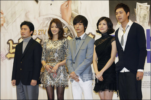 22일 서울 서초구 반포동 팔래스호텔에서 열린 KBS 새 월화 드라마 ‘부자의 탄생’의 제작발표회에서 출연진들이 포토타임을 갖고 있다. 왼쪽부터 이진서 PD,이시영, 남궁민, 이보영, 지현우.