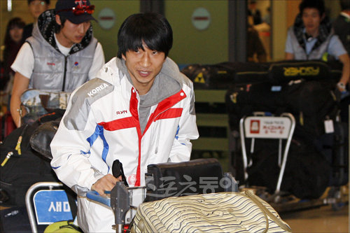 2010 밴쿠버 동계올림픽 남자 스피드 스케이팅 메달 획득에 실패한 이규혁이 23일 스키점프 대표팀과 함께 인천국제공항을 통해 입국하고 있다. 이번 대회에서 이규혁은 500m에서 15위, 1,000m에서는 9위에 그쳤고, 스키점프 팀은 노멀힐(K-95)과 라지힐(K-125) 모두 결선라운드 진출에 실패했다.