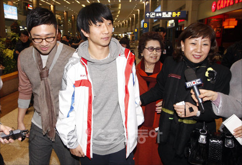 2010 밴쿠버 동계올림픽 남자 스피드 스케이팅 메달 획득에 실패한 이규혁이 23일 인천국제공항을 통해 입국했다. 이규혁이 마중 나온 가족들과 함께 집으로 향하고 있다. 이번 대회에서 이규혁은 500m에서는 15위, 1,000m에서는 9위에 그쳤다.
