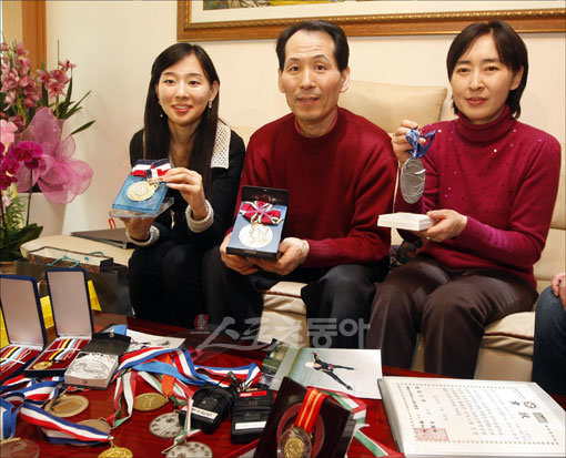 24일(한국시간) 2010 밴쿠버 동계올림픽 스피드스케이팅 남자 10,000m에서 금메달을 거머쥔 이승훈의 본가가 위치한 서울 중구 예장동. 누나 이연재 씨, 아버지 이수용 씨, 어머니 윤기수 씨(왼쪽부터)가 이승훈이 각종 대회에서 땄던 메달을 들고 포즈를 취하고 있다.