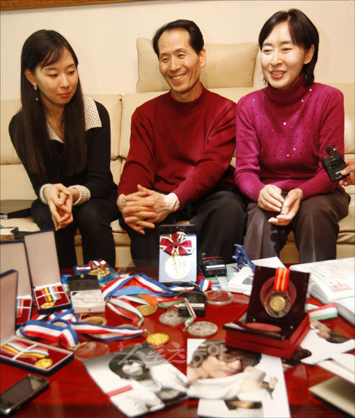 24일(한국시간) 2010 밴쿠버 동계올림픽 스피드스케이팅 남자 10,000m에서 금메달을 거머쥔 이승훈의 큰아버지 집이 위치한 서울 중구 예장동. 누나 이연재 씨, 아버지 이수용 씨, 어머니 윤기수 씨(왼쪽부터)가 취재진과 인터뷰를 하고 있다.