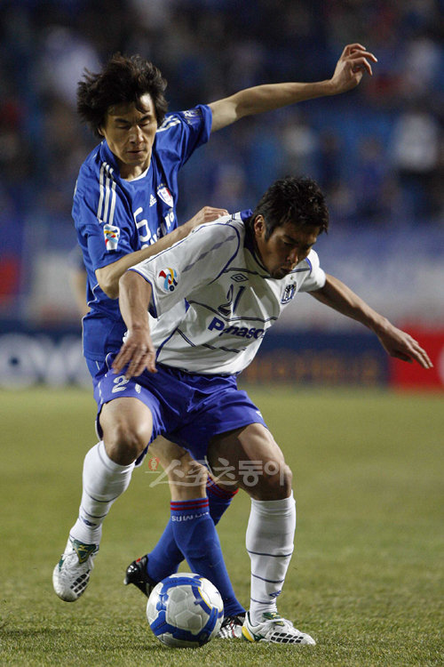 2010 아시아축구연맹(AFC) 조별리그 G조 1차전 수원 삼성 대 일본 J-리그의 강호 감바 오사카 경기가 24일 수원월드컵경기장에서 열렸다. 수원 삼성 리웨이펑과 오사카 아키라가 볼을 다투고 있다.