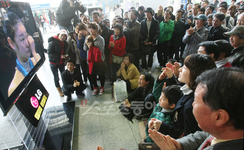 6일 오전 서울역에서 시민들이 TV를 통해 김연아의 우승순간을 지켜보고 있다.