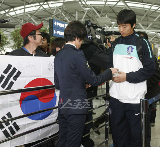 이동국이 28일 오전 인천국제공항 출국장을 통과하고 있다. 축구대표팀은 다음 달 3일 영국 런던에서 코트디부아르와 평가전을 치른다.