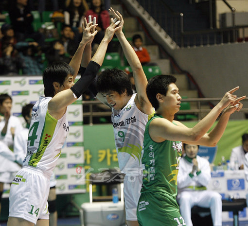 28일 장충체육관에서 열린 2009-2010 V리그 우리캐피탈과 대한항공의 경기에서 우리캐피탈이 공격에 성공한후 김현수(왼쪽)와 강영준이 기뻐하고 있다.