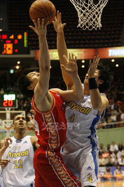 1일 오후 잠실실내체육관에서 열린 2009 남자프로농구 서울 삼성 대 울산 모비스의 경기. 모비스 김효범이 슛을 시도하자 삼성 김동욱이 막고 있다.