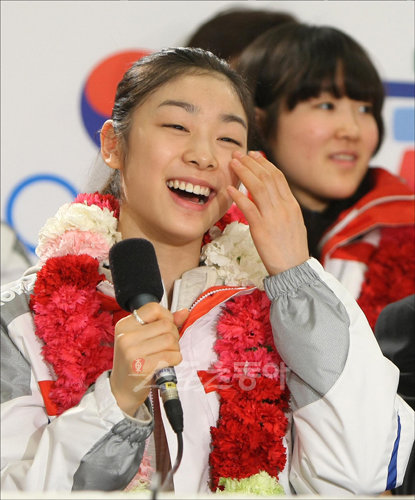 2010 밴쿠버 동계올림픽에서 금메달 6개, 은메달 6개, 동메달 2개를 획득해 종합 5위로 역대 최고의 성적을 거둔 한국선수단이 2일 오후 인천국제공항을 통해 입국했다. 귀국기자회견에 자리한 '피겨퀸' 김연아가 밝게 미소 짓고 있다.