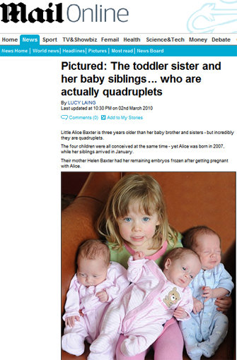 영국 대중지 데일리메일은 2일(현지시간) 같은 날 같은 시간에 수정이 됐으나 3년의 터울을 두고 태어난 앨리스 백스터(3)와 세 쌍둥이의 이야기를 보도했다.