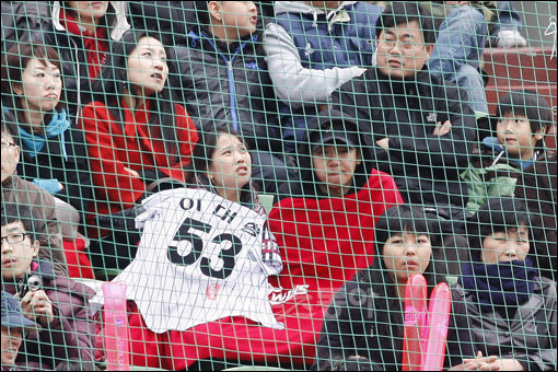 2010 프로야구 시범경기 넥센히어로즈 대 LG트윈스의 경기가 7일 오후 서울 목동야구장에서 열렸다. 야구장을 찾은 한 커플이 담요와 유니폼을 덮고 관전하고 있다.
