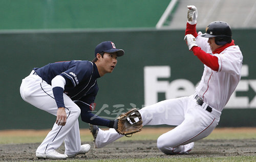 2010 프로야구 시범경기 SK와 두산의 경기가 7일 문학구장에서 열렸다. 4회말 1사 1루 김연훈 타석때 1루 주자 모창민 2루 도루 성공.