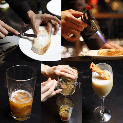 고정 관념을 깬 칵테일이 속속 쏟아지고 있다. 빵에 버터를 바르고, 토치로 버터를 녹이고, 위스키에 절이고, 빵을 제거한 후 다른 셰이커에 따르고, 칵테일 글라스에 옮기면 (왼쪽부터) 창조적인 칵테일이 완성된다.