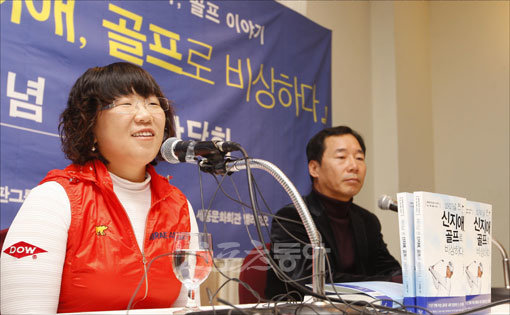 프로골퍼 신지애(왼쪽)의 아버지 신제섭 씨가 저술한 ‘파이널 퀸 신지애, 골프로 비상하다’출간 기념 기자회견이 9일 오전 서울 세종문화회관 벨라지오에서 열린 가운데 신지애가 취재진의 질문에 답하고 있다.