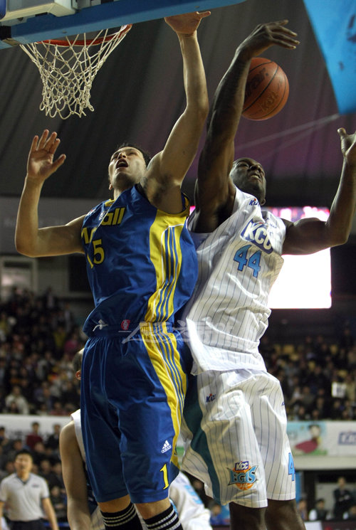 골밑 강자 존슨의 힘! KCC 용병 존슨(오른쪽)과 삼성 이승준이 11일 전주실내체육관에서 열린 2009∼2010 프로농구 6강 플레이오프 1차전에서 치열한 골밑 리바운드 다툼을 벌이고 있다.