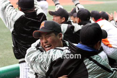 12일 서울 목동야구장에서 열린 황금사자기(동아일보사 스포츠동아 대한야구협회 공동 주최) 전국고교야구대회 첫째날. 연장 10회초 광주진흥고와 광주동성고의 4:4 동점 상황의 광주진흥고의 공격에서 33번 김도현 선수의 안타로 6:4로 앞서가게 된 광주진흥고의 선수들이 기뻐하고 있다.