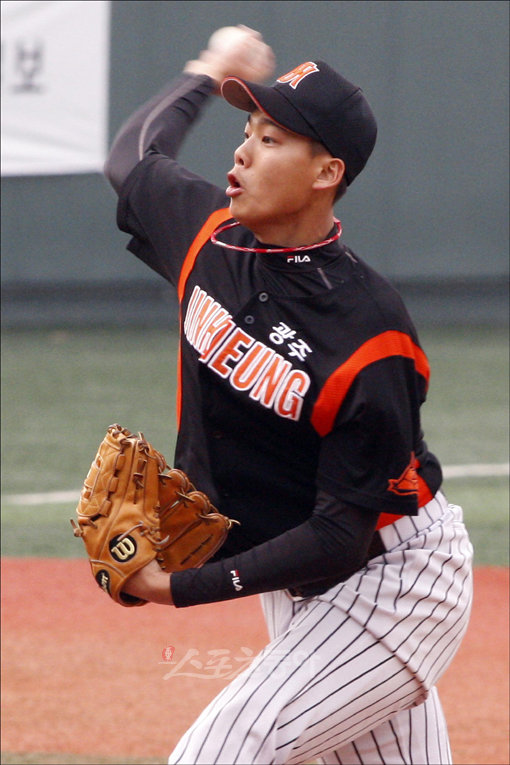 아마추어와 프로를 통틀어 올해 가장 먼저 열리는 제64회 황금사자기 전국고교대회가 12일 목동야구장에서 18일간의 대장정의 막을 올렸다. 동향 라이벌 광주 동성고와 진흥고의 경기. 진흥고 투수 양승철이 역투하고 있다.