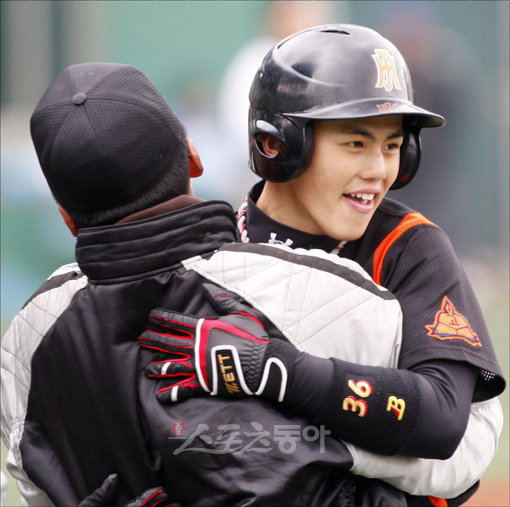 6회초 2사 1루서 그라운드 홈런을 친 진흥고 장민규가 홈에 들어와 코치와 함께 포옹하고 있다.