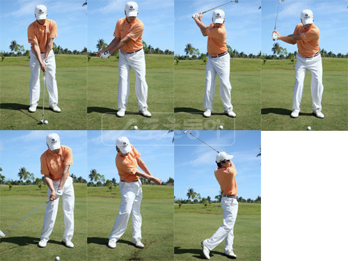 5. 임팩트 직전까지 손목 코킹이 유지되고 있다. 부드럽고 유연한 어프로치 샷을 위해서는 임팩트 순간 파워보다는 균형을 유지하는데 더 신경 써야 한다. 임팩트 순간 너무 강하게 클럽을 풀어놓으면 자세가 흔들린다.