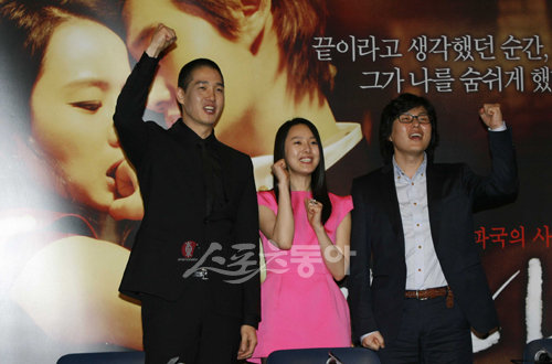 15일 오후 서울 왕십리 CGV에서 열린 영화 ‘비밀애’의 언론시사회에서 유지태, 윤진서, 류훈 감독(왼쪽부터)이 대박기원 화이팅을 외치고 있다.