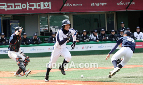 16일 서울 목동야구장에서 열린 제64회 황금사자기(동아일보사 스포츠동아 대한야구협회 공동 주최) 전국고교야구대회 다섯째날 포철공고-대전고의 경기. 4회말 대전고의 김영준(가운데)이 번트 시도후 1루로 질주하고 있다.