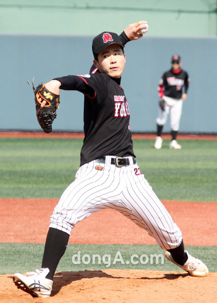 18일 서울 목동야구장에서 열린 제64회 황금사자기(동아일보사 스포츠동아 대한야구협회 공동 주최) 전국고교야구대회 마산용마고-충암고의 경기. 마산용마고의 투수 배준빈이 역투를 펼치고 있다.