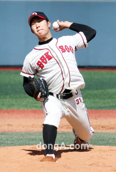 18일 서울 목동야구장에서 열린 제64회 황금사자기(동아일보사 스포츠동아 대한야구협회 공동 주최) 전국고교야구대회 2회전(32강) 덕수고-울산상고의 경기. 덕수고의 투수 이성복이 역투를 펼치고 있다.