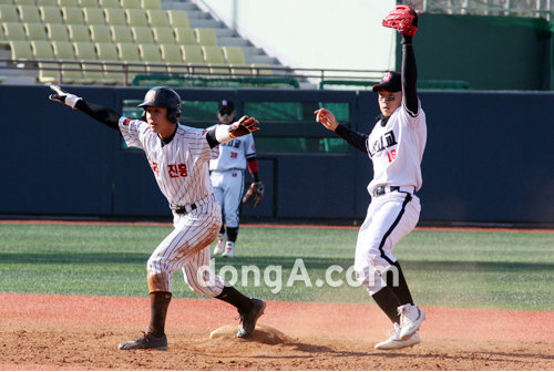 18일 서울 목동야구장에서 열린 제64회 황금사자기(동아일보사 스포츠동아 대한야구협회 공동 주최) 전국고교야구대회 2회전(32강) 동산고-광주진흥고의 경기. 3회말 광주진흥고의 장민규(왼쪽)가 2루 도루 시도 후 심판을 보며 세이프 사인을 보내고 있다.