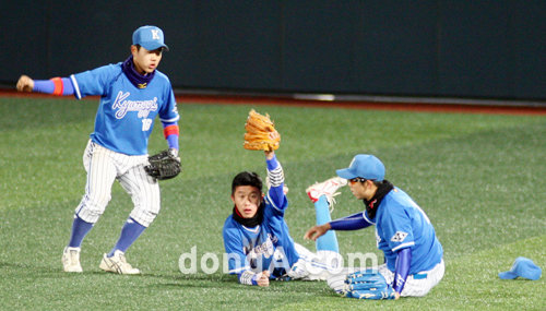 18일 서울 목동야구장에서 열린 제64회 황금사자기(동아일보사 스포츠동아 대한야구협회 공동 주최) 전국고교야구대회 2회전(32강) 야탑고-경기고의 경기. 5회초 경기고의 외야수들이 날아오는 공을 잡는 과정에서 충돌했지만 공을 놓치지 않았다.