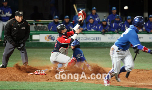 18일 서울 목동야구장에서 열린 제64회 황금사자기(동아일보사 스포츠동아 대한야구협회 공동 주최) 전국고교야구대회 2회전(32강) 야탑고-경기고의 경기. 5회말 야탑고의 정인석(왼쪽 두번째)이 홈인하는 야탑고의 정명구(오른쪽 두번째)를 저지하고 하고 있다.