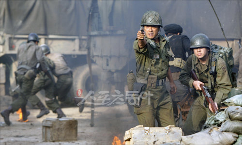 배우 차승원, 권상우, 탑, 김승우가 주연한 영화 '포화속으로'(감독 이재한)의 제작 현장이 19일 경남 합천영상테마파크에서 공개 된 가운데 김승우가 열연 하고 있다.