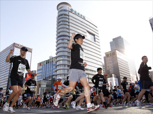국제육상경기연맹(IAAF)이 인정하는 최고등급인 골드 라벨을 받음으로써 세계 최고의 보스턴마라톤과 어깨를 나란히 하게 된 2010서울국제마라톤대회 겸 제81회 동아마라톤대회가 21일 오전 8시 서울 세종로 이순신 장군 동상 앞에서 출발 총성을 울렸다. 마스터스 부문에 참가한 일반인들이 역주하고 있다.