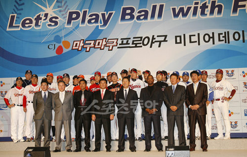 22일 서울 그랜드 인터컨티넨탈 호텔에서 프로야구 8개 구단 감독과 선수들이 한 자리에 모이는 미디어데이 행사가 열려 참석자들이 기념촬영을 하고 있다.