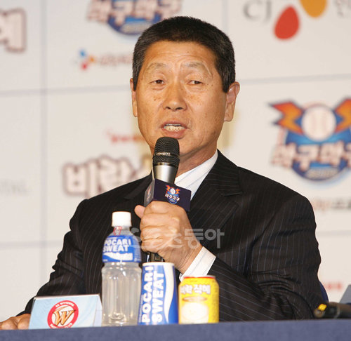 22일 서울 그랜드 인터컨티넨탈 호텔에서 프로야구 8개 구단 감독과 선수들이 한 자리에 모이는 미디어데이 행사가 열렸다. 행사에 참석한 SK 김성근 감독이 취재진의 질문에 답하고 있다.