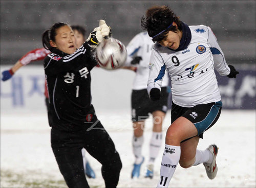 22일 고양종합운동장에서 열린 2010 WK리그 개막전 고양 대교와 부산 상무의 대교 박희영이 상무 김주옥 골키퍼와 충돌하고 있다.