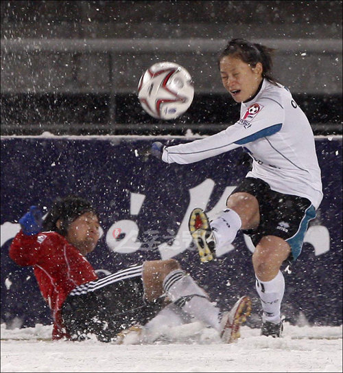 22일 고양종합운동장에서 열린 2010 WK리그 개막전 고양 대교와 부산 상무의 대교 이은혜가 동료에게 볼을 연결하려 안간힘을 쓰고 있다.