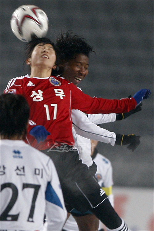 22일 고양종합운동장에서 열린 2010 WK리그 개막전 고양 대교와 부산 상무의 경기에서 상무 정지애와 대교 쁘레치냐가 공중볼을 다투고 있다.