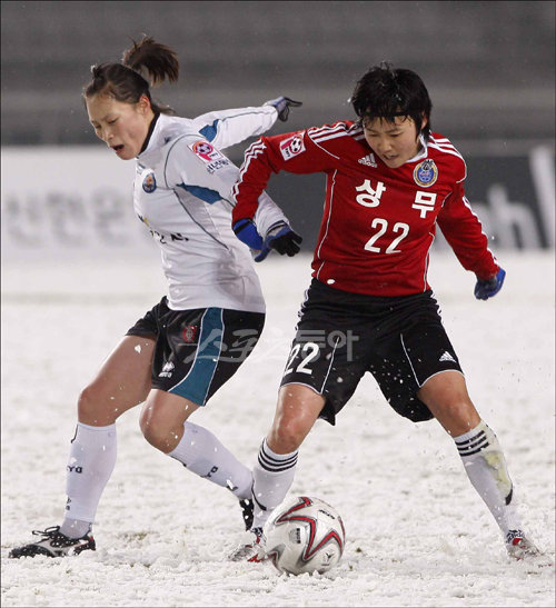 22일 고양종합운동장에서 열린 2010 WK리그 개막전 고양 대교와 부산 상무의 대교 이은혜와 상무 문유진이 볼을 두고 몸싸움을 벌이고 있다.