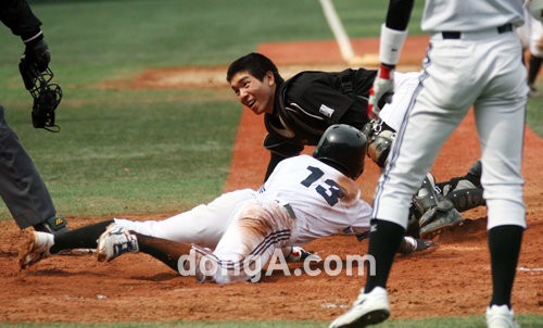 23일 서울 목동야구장에서 열린 제64회 황금사자기(동아일보사 스포츠동아 대한야구협회 공동 주최) 전국고교야구대회 16강전 제주고-경북고의 경기. 6회말 제주고의 포수 강환준이 이성하를 아웃시키고 있다.